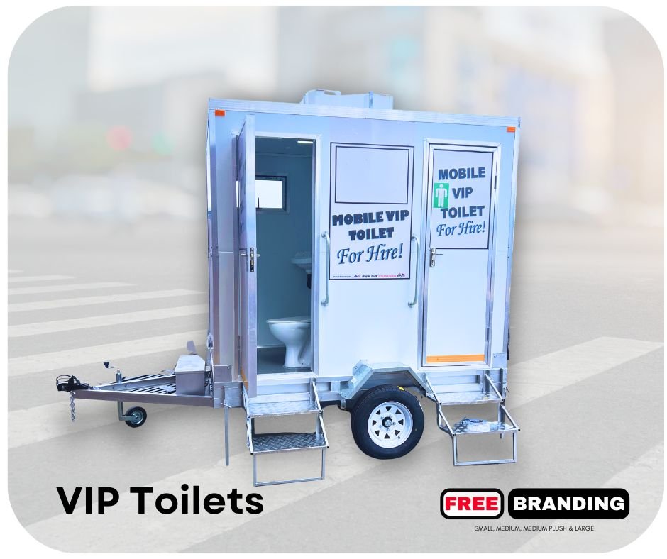 VIP toilets for sale are mobile and have more than one cubicle Small (2M L x 2M H x 1.2M W), Standard Medium (2.4M L x 2M H x 1.6M W), and Large (2.8M L x 2.1M H x 1.6M W